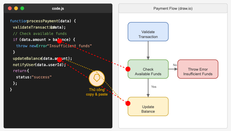 Ban đầu, team sử dụng các công cụ vẽ diagram phổ biến như Lucid Chart và Figjam để ghi lại logic xử lí trong codebase. Tuy nhiên, khi diagram lớn hơn, tụi mình gặp phải một vấn đề quan trọng: Sự thiếu liên kết giữa code files và diagram khiến team phải liên tục chuyển đổi ngữ cảnh giữa môi trường lập trình (IDE) và công cụ vẽ.